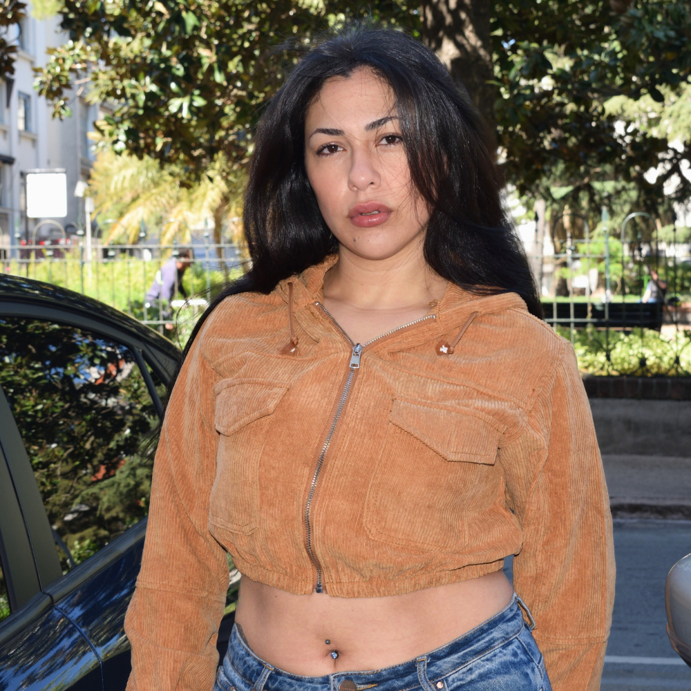 Trucker de corderoy color camel, corte cropped a la cintura, capucha con cordón y cierre metálico. Suave, liviana y combinable todo el año.