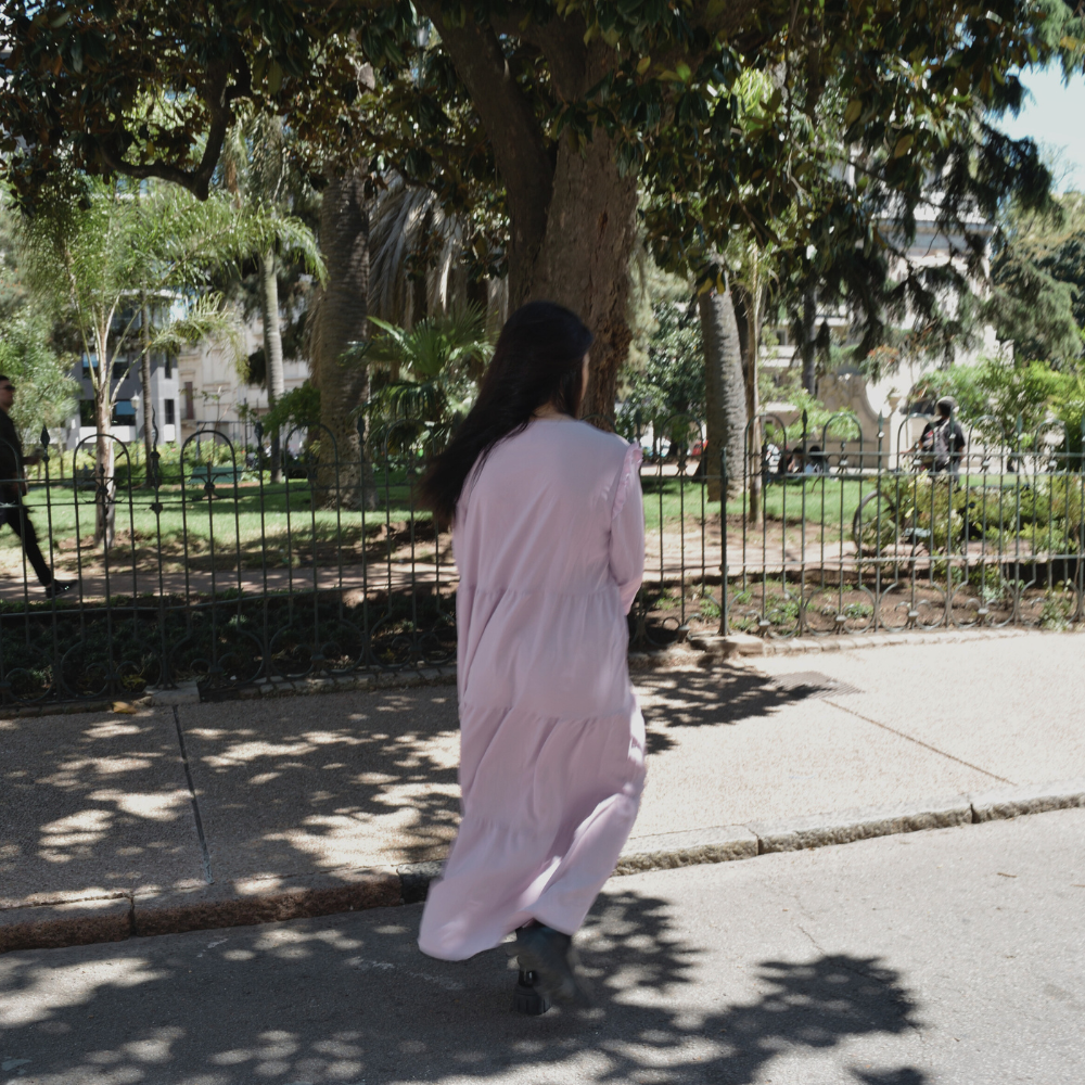 Vestido maxi de silueta suelta en color lila suave, con volados en hombros y falda con recortes escalonados. Manga larga y escote redondo. Liviano, fluido y cómodo para todos los días.