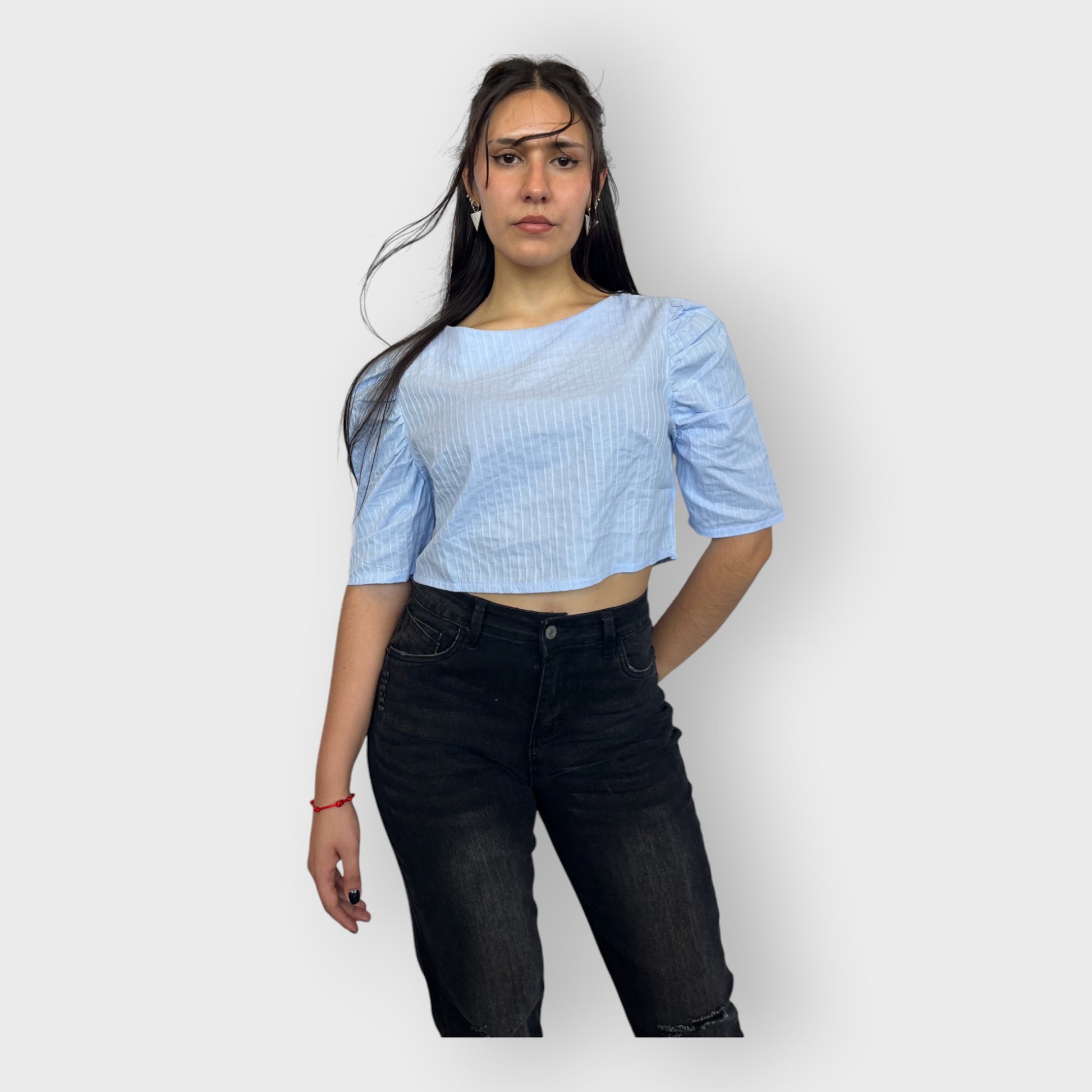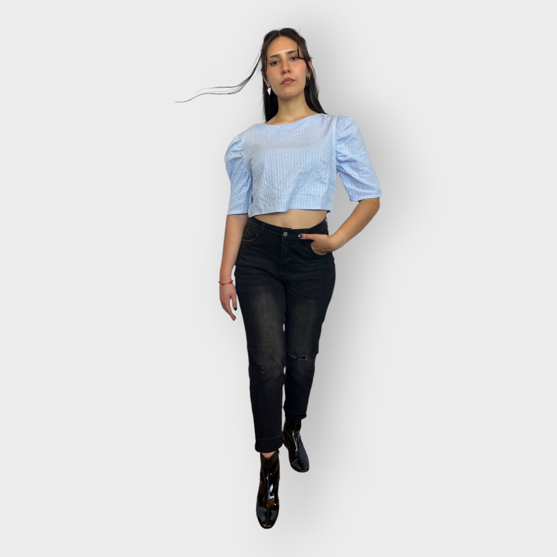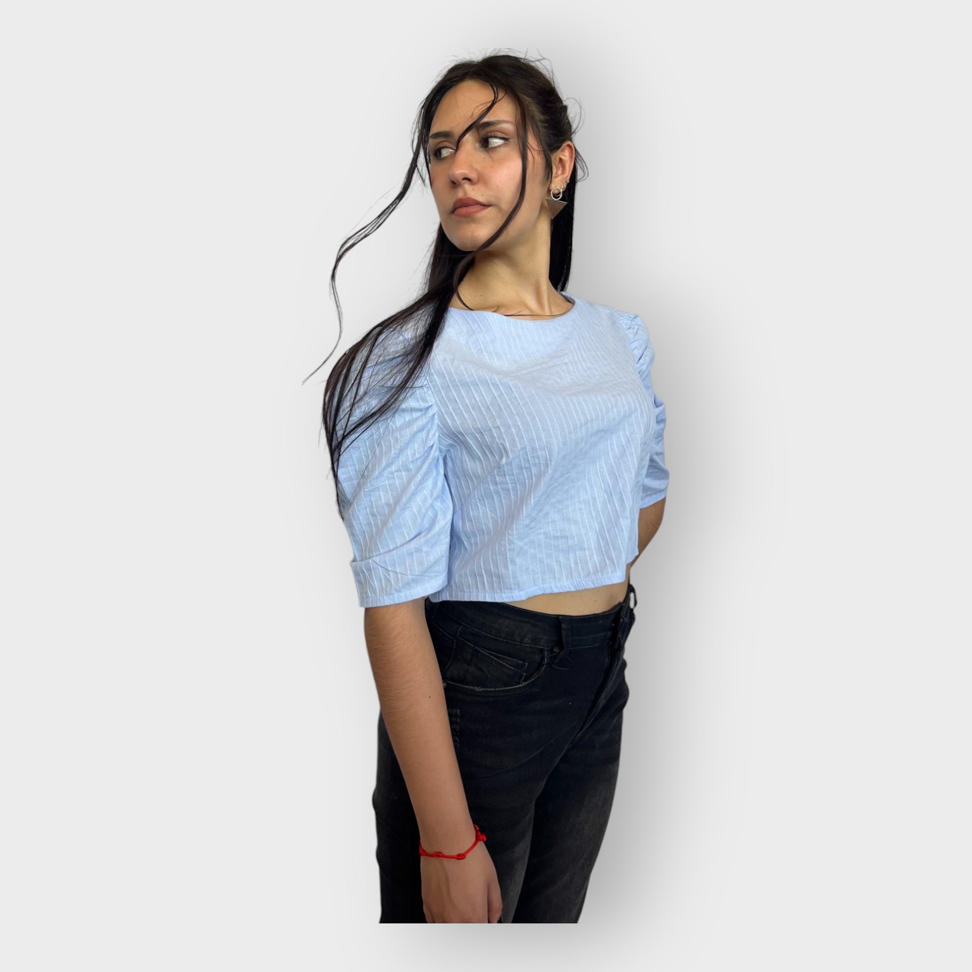 Esta blusa de ORA destaca por su elegante diseño de escote a la base y mangas abullonadas hasta el codo, terminando en un elegante puño que añade un toque moderno. La silueta corta hasta la cintura la hace versátil y perfecta para adaptarse tanto a looks casuales como formales. Su tejido fresco la convierte en una opción ideal para cualquier época del año. Disponible en los clásicos colores azul claro, negro y blanco, es una prenda imprescindible para quienes buscan estilo y comodidad en una sola pieza.