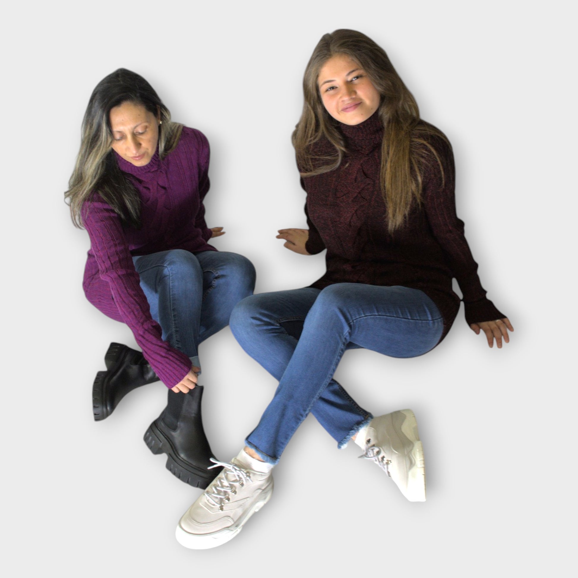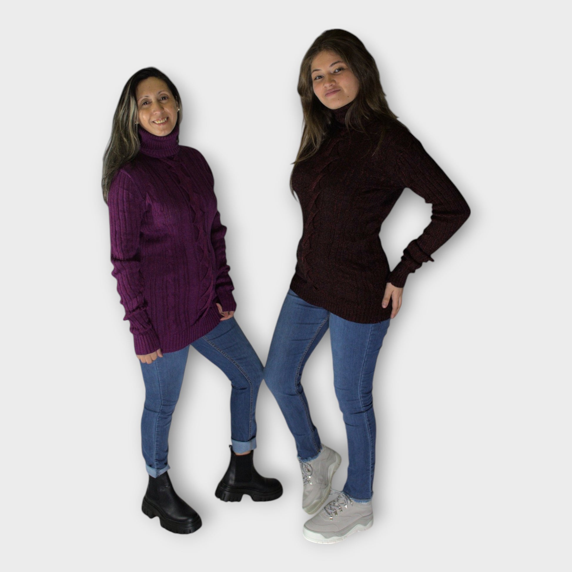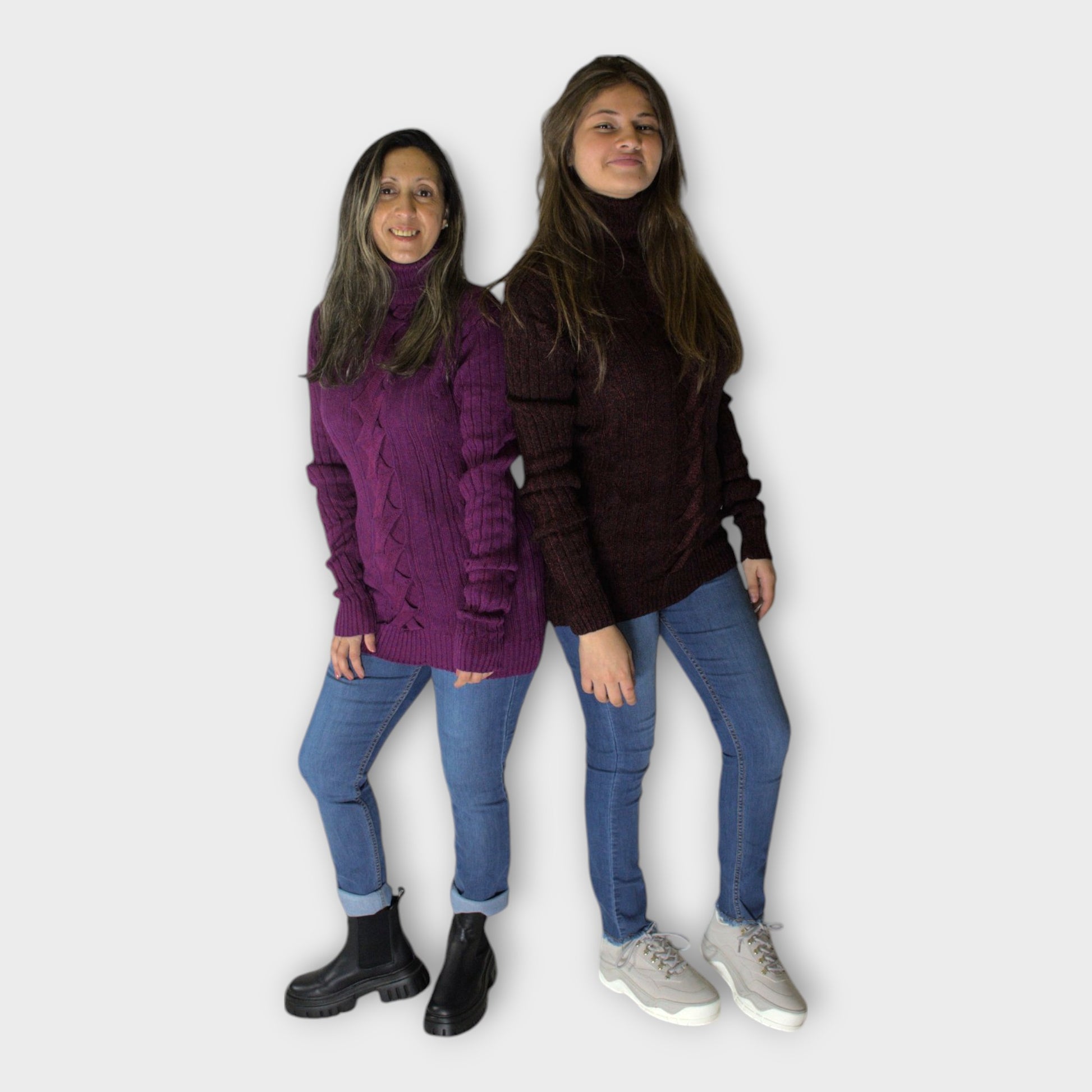 Este buzo largo de ORA, confeccionado en hilo fino, se destaca por su cuello polera y una trenza superpuesta en relieve que adorna el frente, aportando textura y un toque distintivo. A pesar de su diseño detallado, no es abrigado debido a la finura del hilo, lo que lo convierte en una opción ideal para días frescos o para usar en capas. Disponible en los sofisticados tonos de violeta y morado matizado con negro, este buzo es perfecto para un look elegante y cómodo o para combinarlo con calzas o jeans para un look mas relajado.