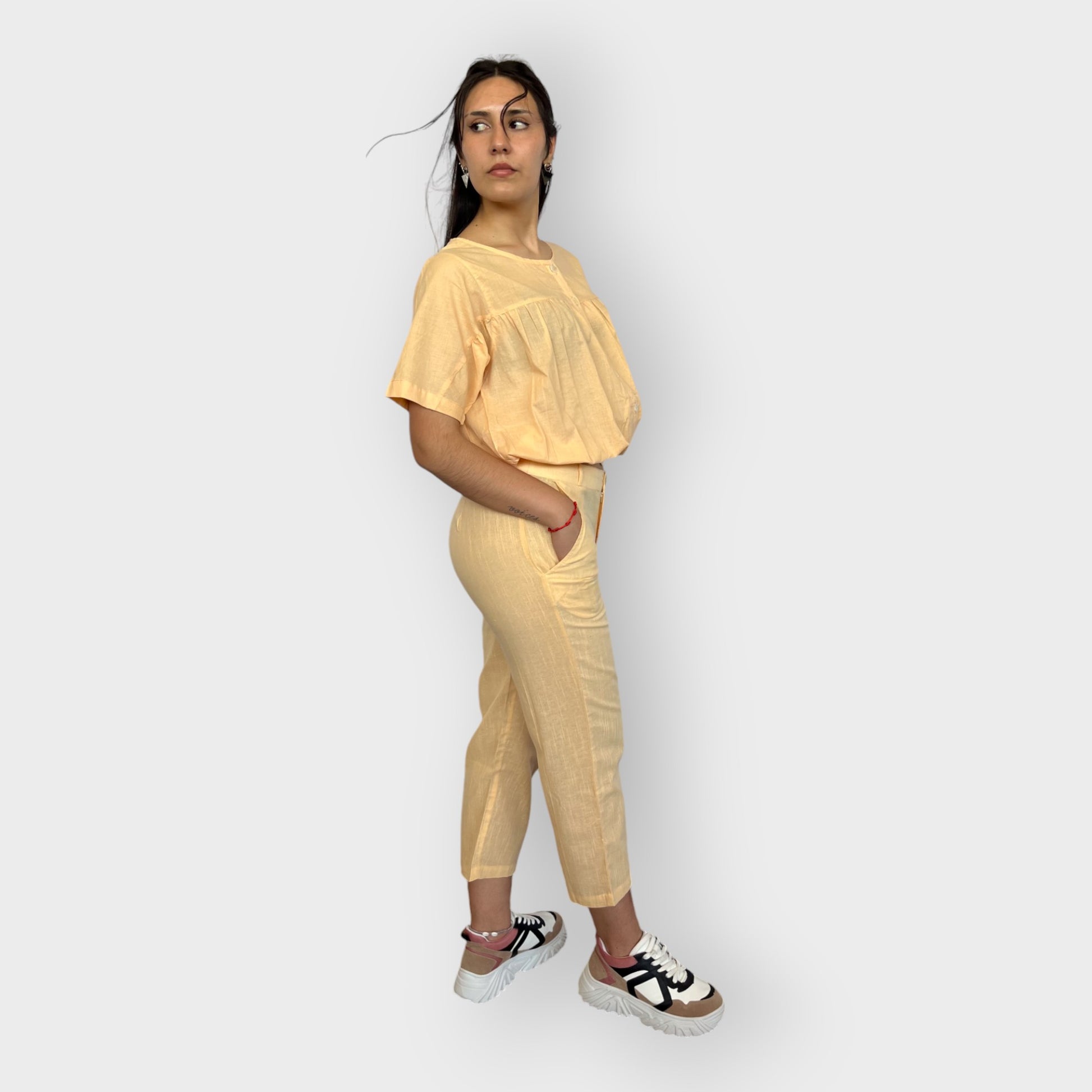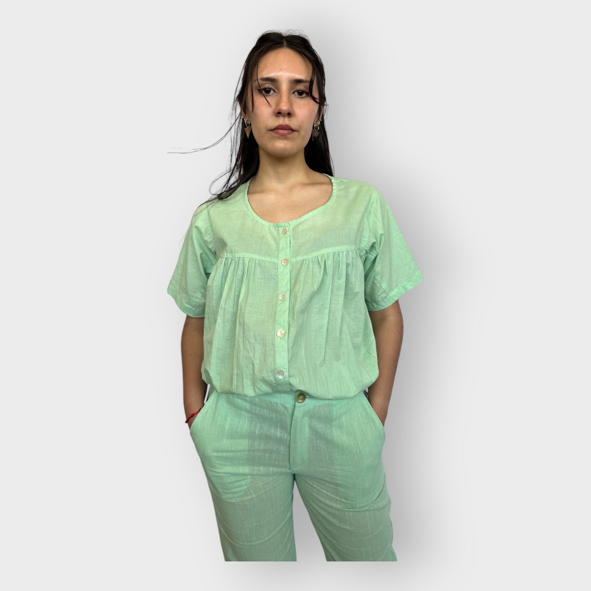 La camisa Kosu es una pieza única que combina estilo y frescura. Su diseño se caracteriza por un delicado canesú fruncido que se prolonga sobre las mangas cortas, aportando volumen y movimiento. El fruncido continúa hasta la cintura, donde una pretina suave lo recoge, definiendo la silueta con sutileza. Confeccionada en una tela liviana y extremadamente fresca, la Kosu es perfecta para los días cálidos, asegurando comodidad sin sacrificar la elegancia. Su escote redondo y el abotonado al frente le dan un toque clásico, haciendo de esta camisa una opción versátil tanto para ocasiones casuales como más formales.