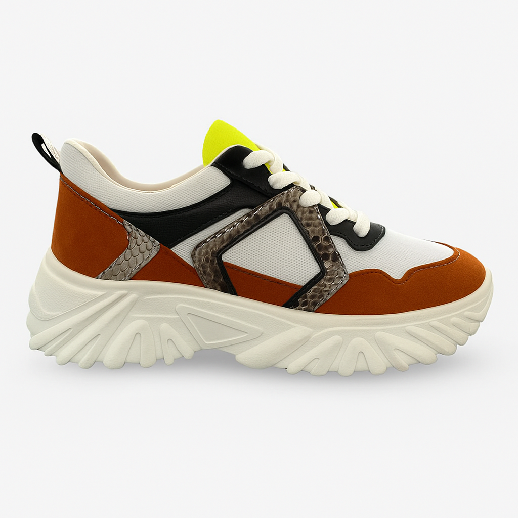 - Diseño multicolor: Combinación vibrante de blanco, negro, naranja y amarillo neón, con detalles texturizados tipo piel de serpiente que aportan un contraste único y llamativo.