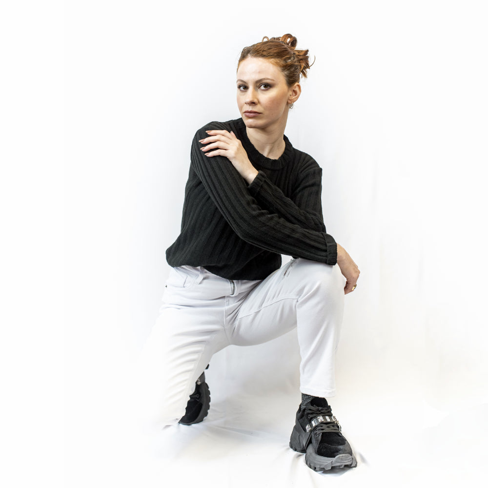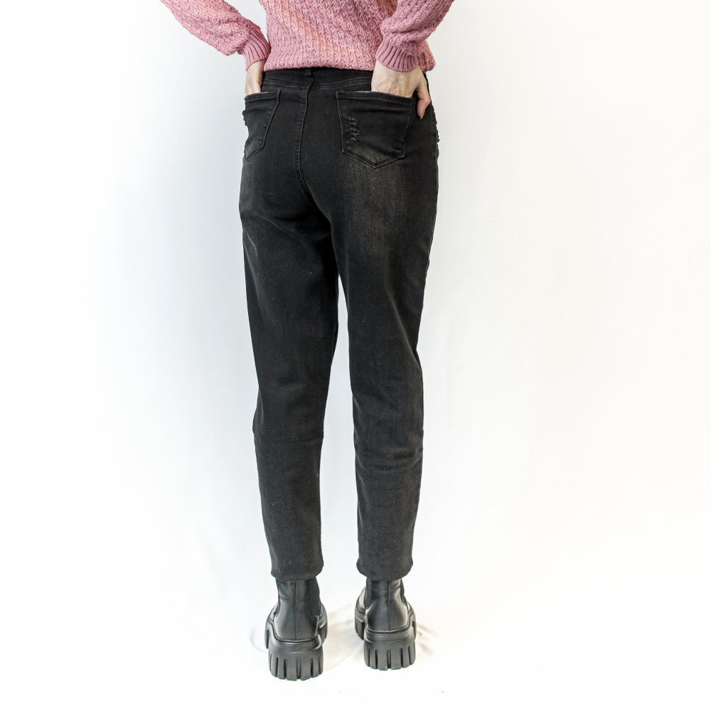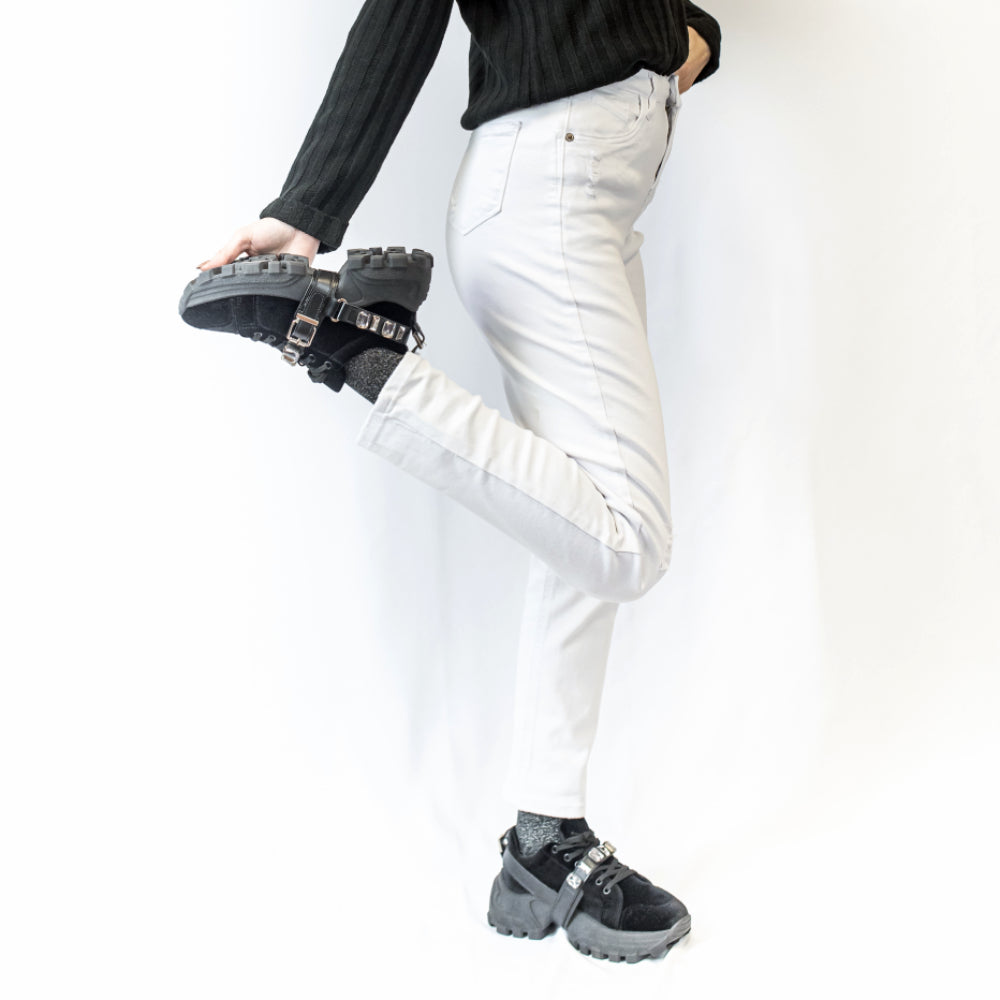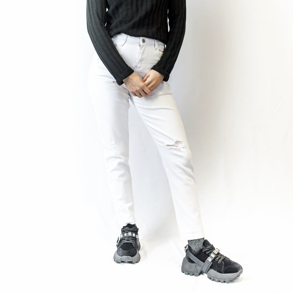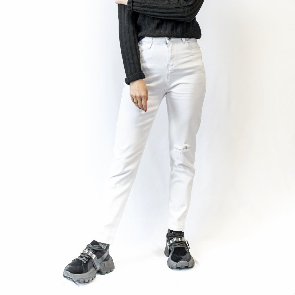 Este jean elastizado skinny está disponible en dos colores versátiles: blanco y negro, ambos con rasgados sutiles que añaden un toque de rebeldía. A pesar de su estilo desenfadado, mantiene un corte elegante que asegura una apariencia sofisticada en todo momento.
