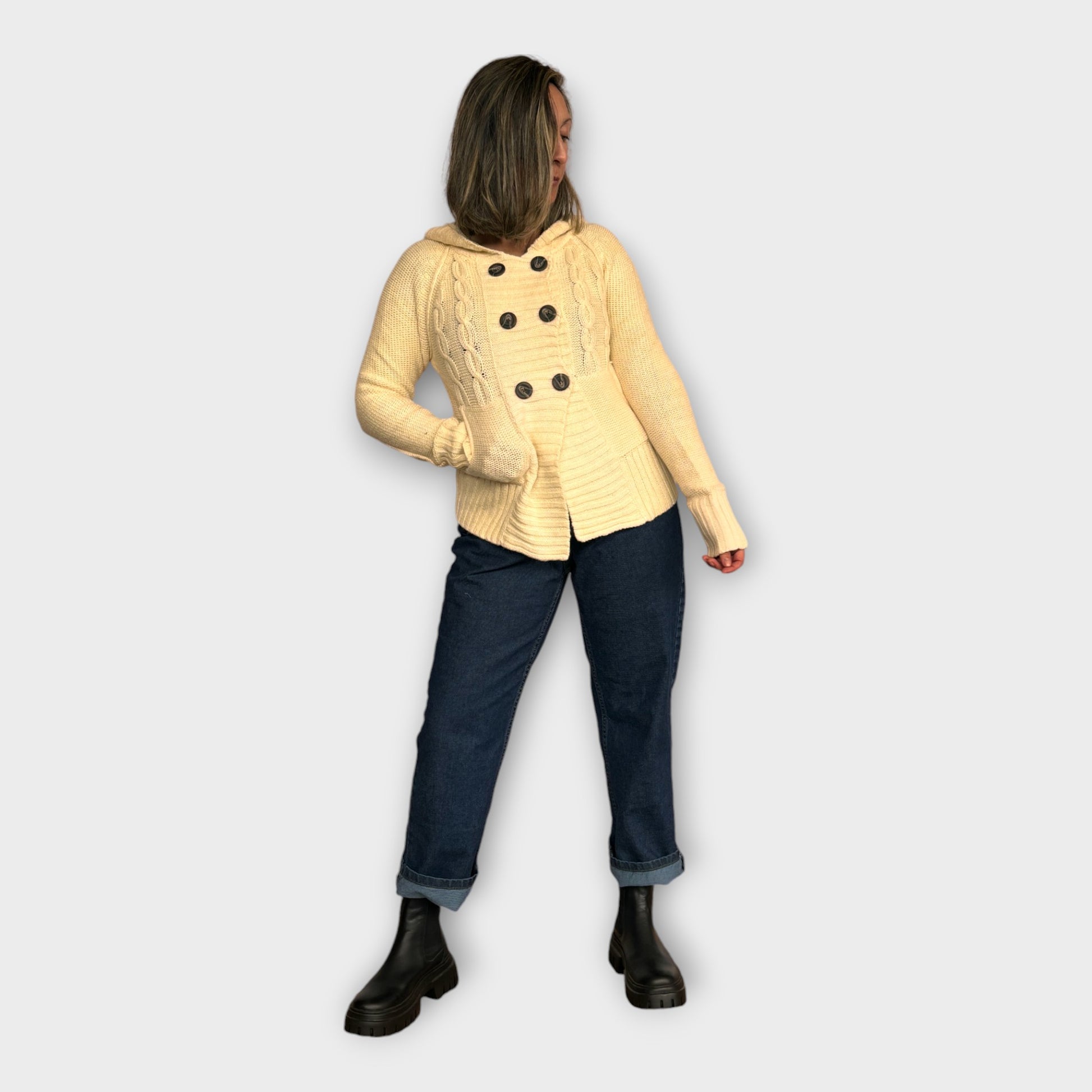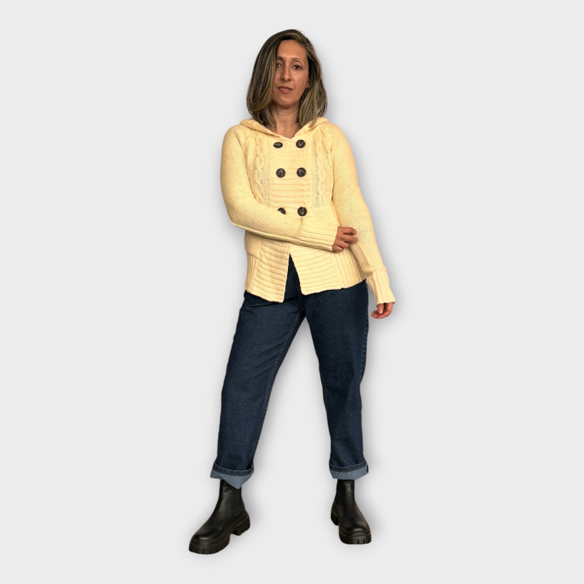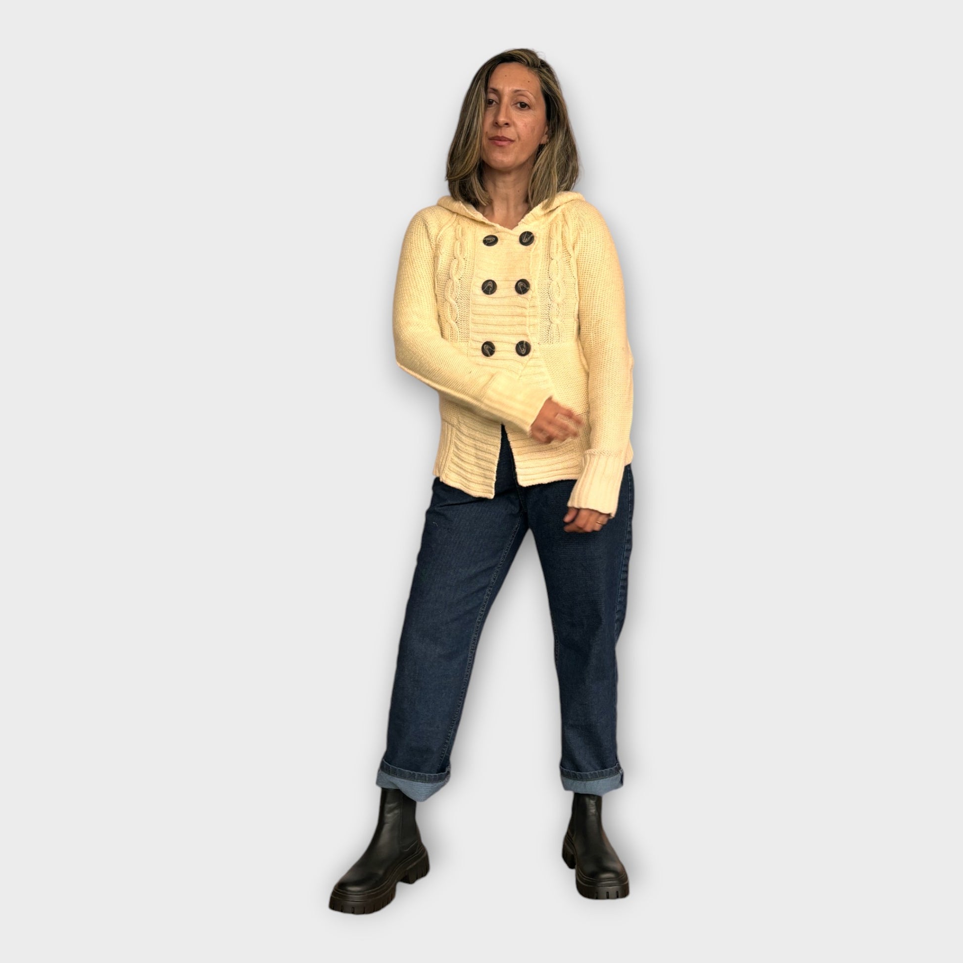 Este saco en hilo es el complemento ideal para las tardecitas frescas de la temporada que se aproxima. Su diseño con capucha y doble hilera de botones le otorga un toque moderno y elegante, perfecto para quienes buscan una prenda ligera pero abrigada. Versátil y fácil de combinar, es ideal para llevar sobre cualquier outfit, brindando estilo y comodidad en los días más frescos. Una pieza imprescindible para la transición entre estaciones.