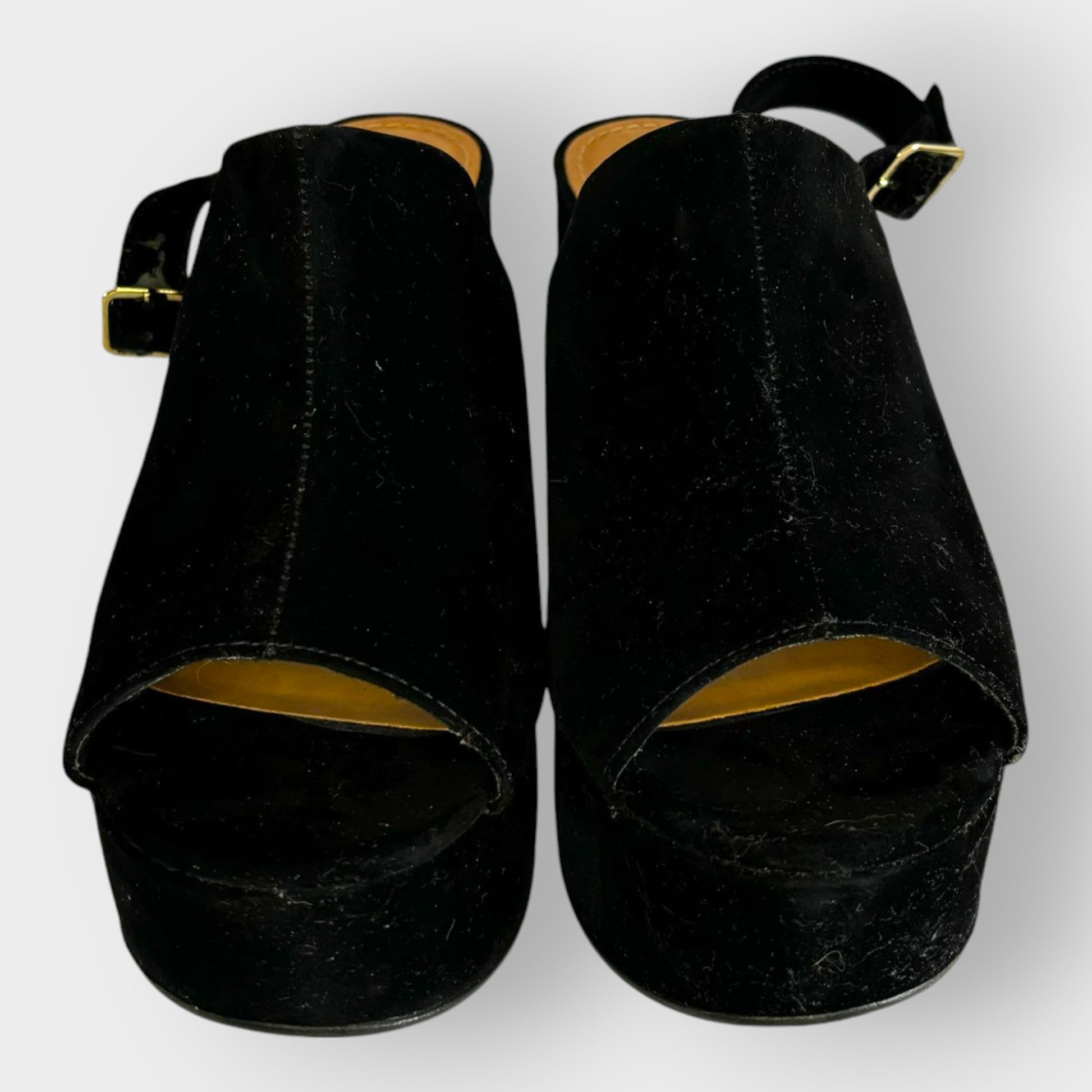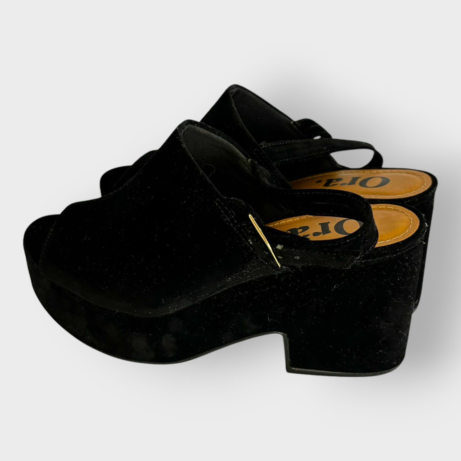 Color negro clásico: Esta versión, elegante y versátil, es ideal para cualquier ocasión, desde looks casuales hasta outfits más formales. Están confeccionadas en un material aterciopelado de alta calidad, con una hebilla metálica dorada ajustable y una plataforma gruesa que brinda estabilidad y altura adicional.
