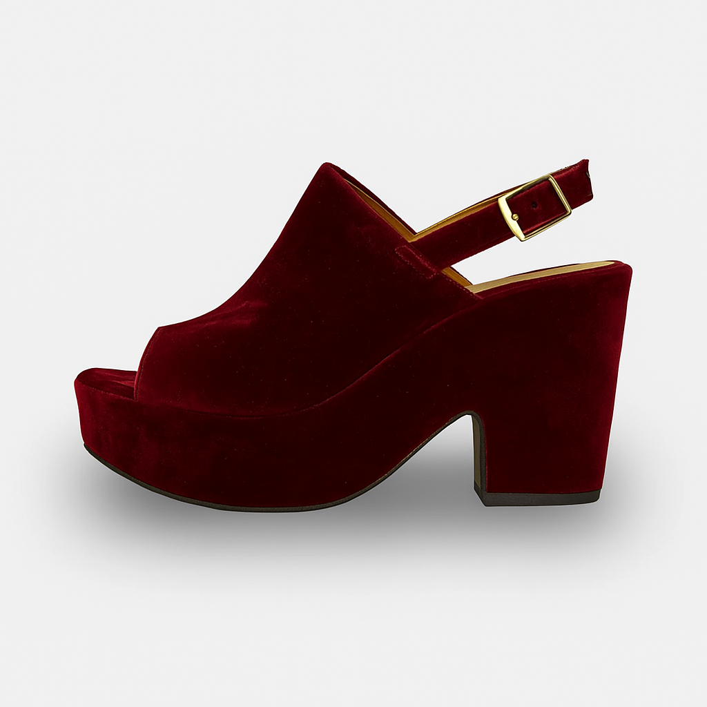 Color bordeaux: Una opción audaz y llamativa, en un elegante tono burdeos que añade un toque de distinción a cualquier atuendo. Al igual que la variante negra, está hecha de un material suave y aterciopelado, y cuenta con detalles cuidados como la hebilla dorada y una cómoda plataforma.