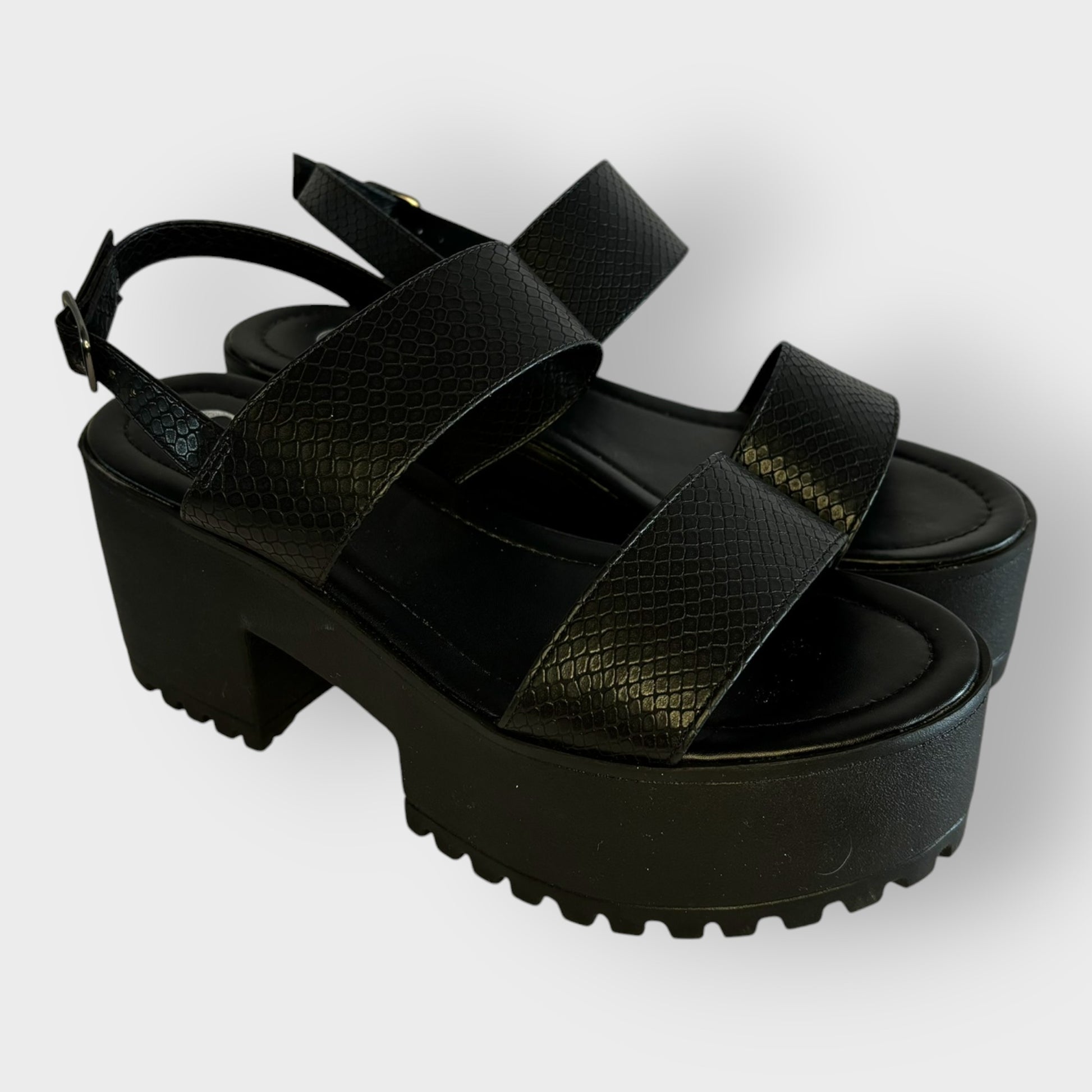 Estas modernas y elegantes sandalias plataforma ofrecen un diseño robusto y sofisticado, ideal para quienes buscan comodidad y estilo en un solo calzado. Disponibles en dos versiones: un atrevido estampado tipo serpiente en tonos dorados y negros, y una opción clásica en color negro liso con acabado texturizado. Ambas versiones cuentan con una plataforma gruesa de goma negra antideslizante que proporciona estabilidad y eleva tu look al siguiente nivel.