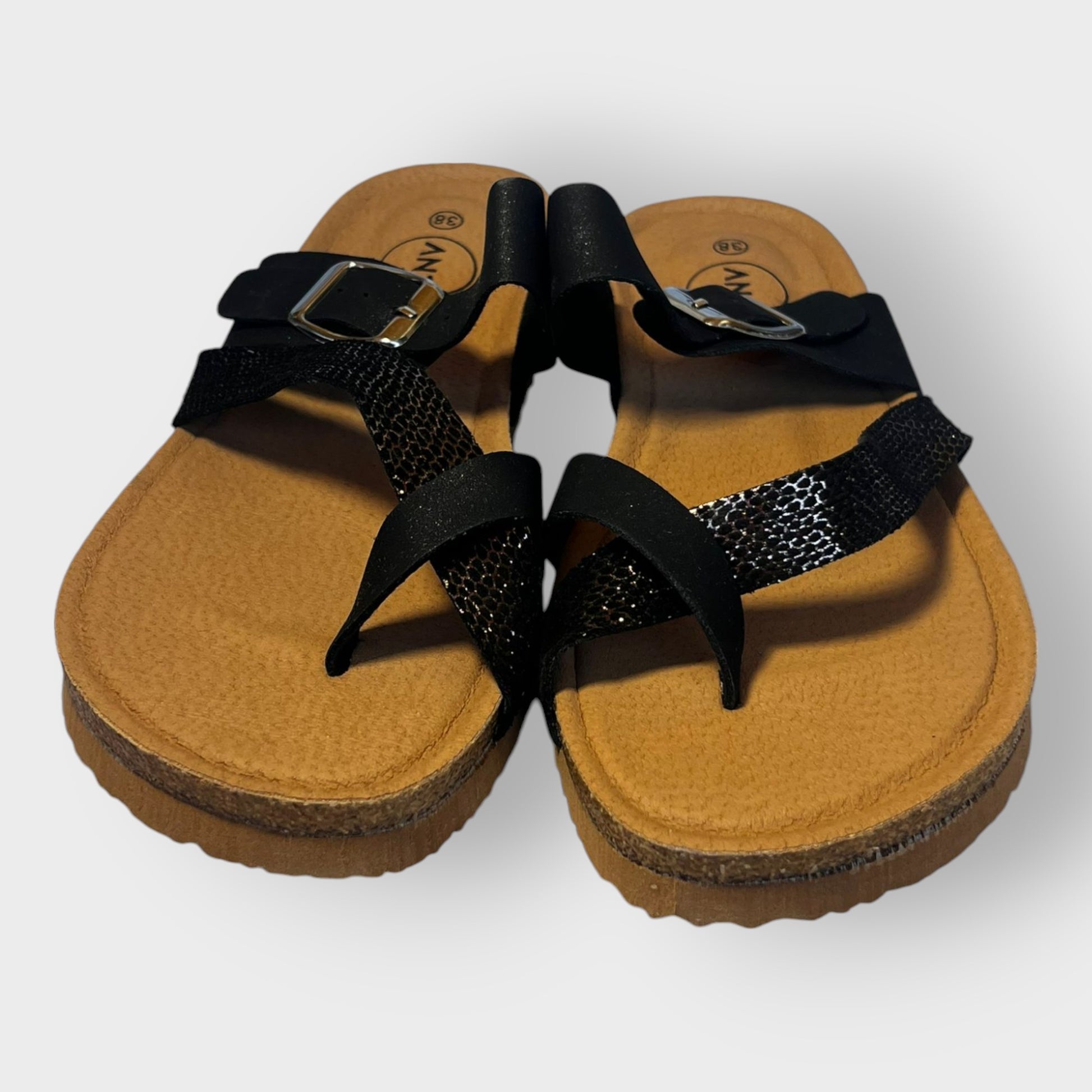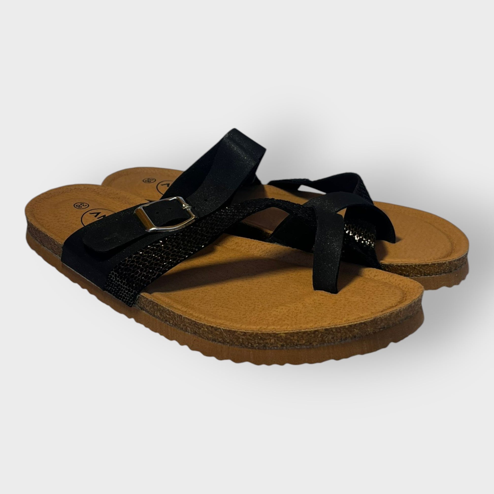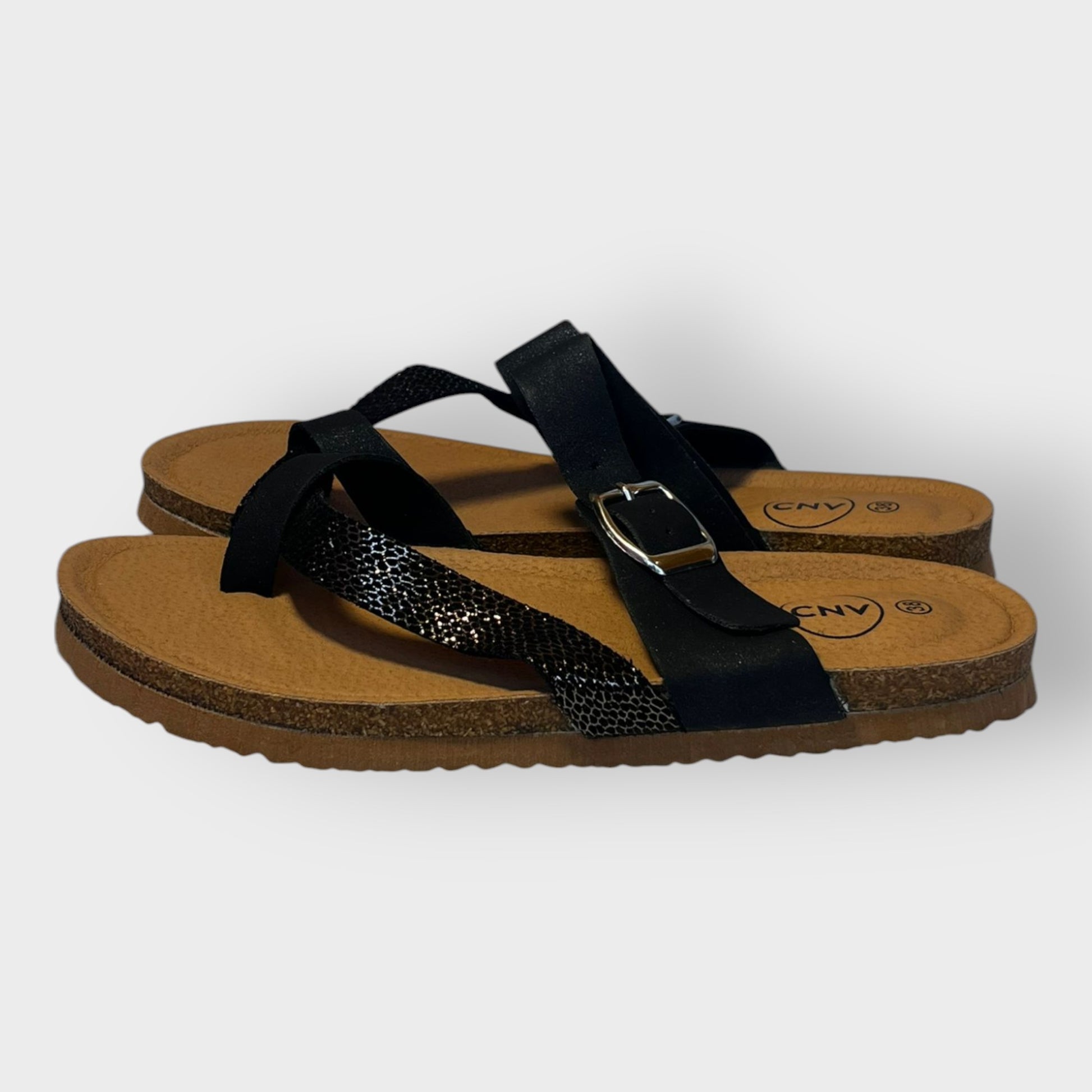 Esta sandalia combina elegancia y comodidad, perfecta para los días de verano. Sus tiras en color negro con acabado brillante aportan un toque sofisticado y moderno al diseño. Incluye una hebilla metálica ajustable que permite un calce personalizado y seguro. La plantilla suave en tono marrón claro garantiza una pisada cómoda durante todo el día, mientras que la suela de goma ofrece estabilidad y un estilo casual. Versátil y chic, es ideal para complementar desde looks relajados hasta conjuntos más elegantes.