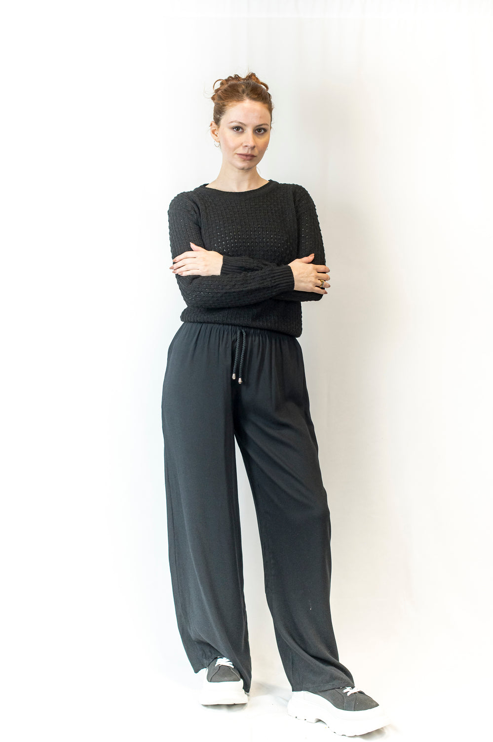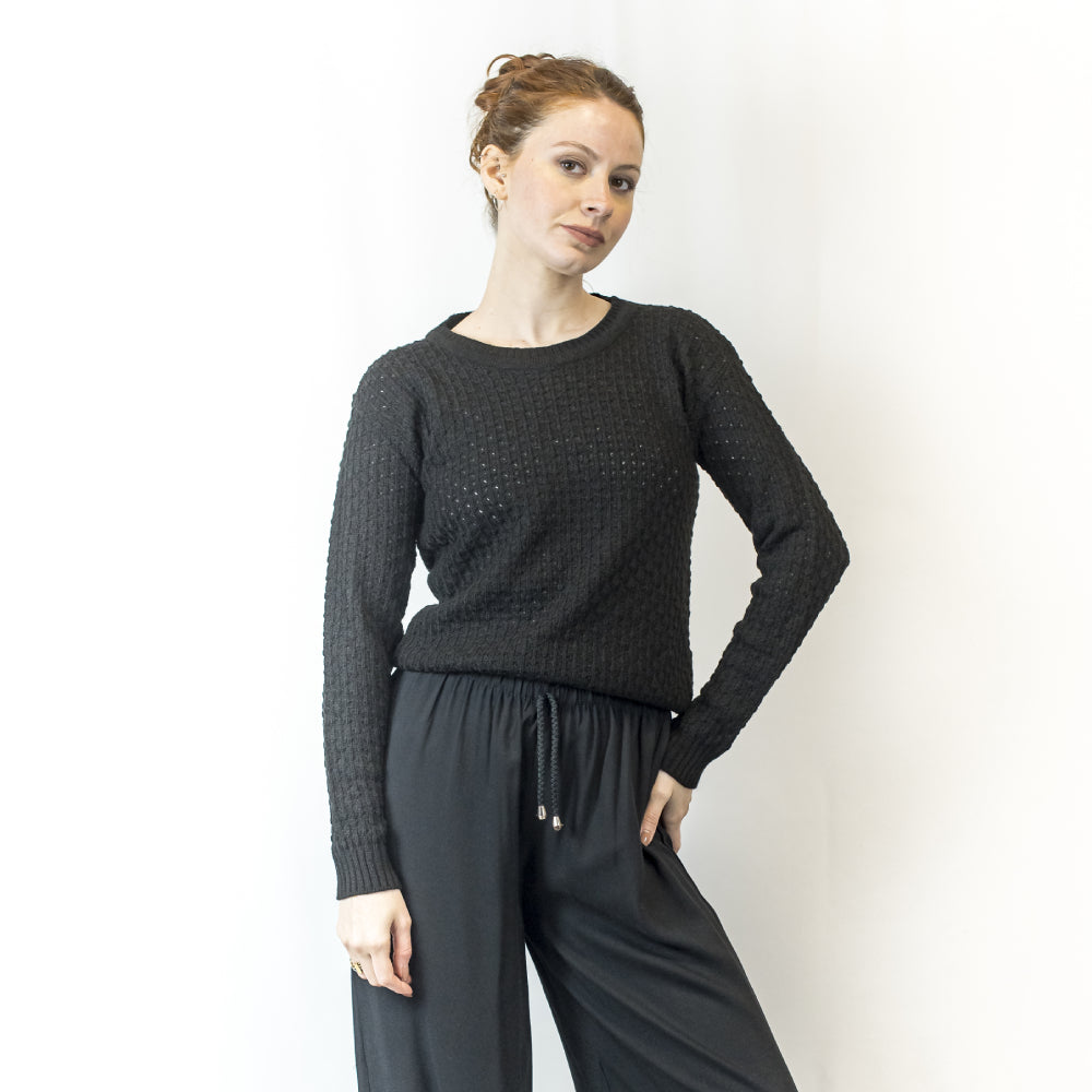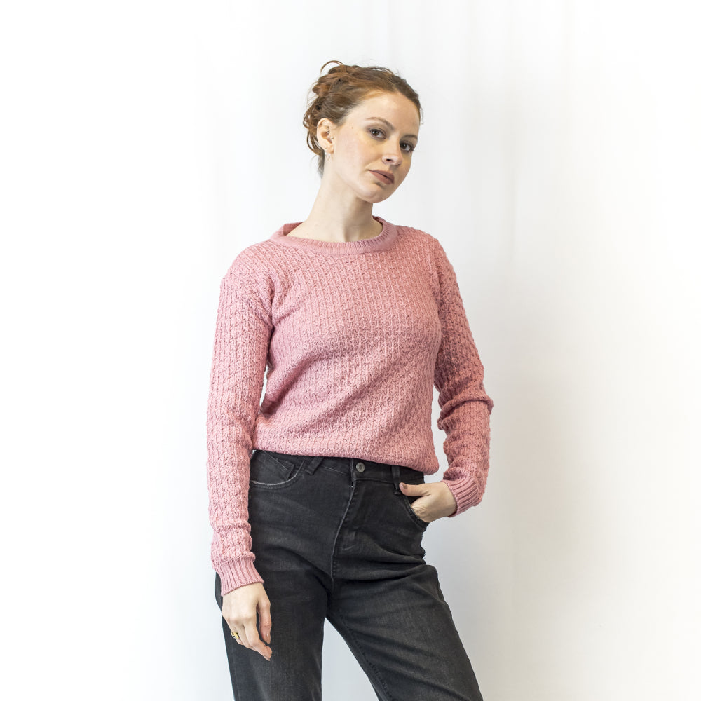 Tejido liviano y calado en color marfil, con cuello redondo, manga larga y ruedo acanalado. Largo a la cintura y textura delicada que eleva cualquier look. Ideal para usar solo o con una básica debajo.