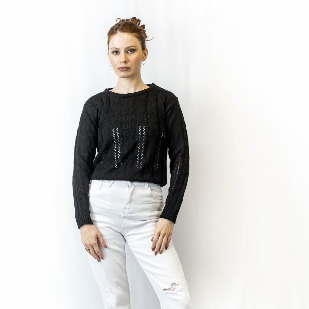 Atrévete a destacar con el sweater de hilo tejido con calado y detalles en los brazos, la prenda perfecta para quienes buscan combinar moda y comodidad en cada ocasión.