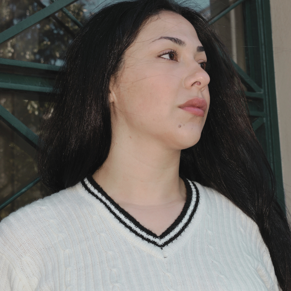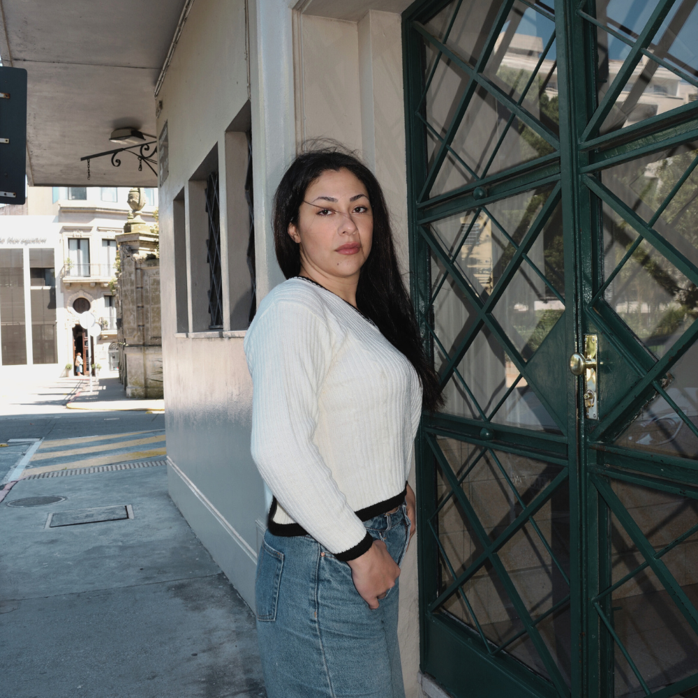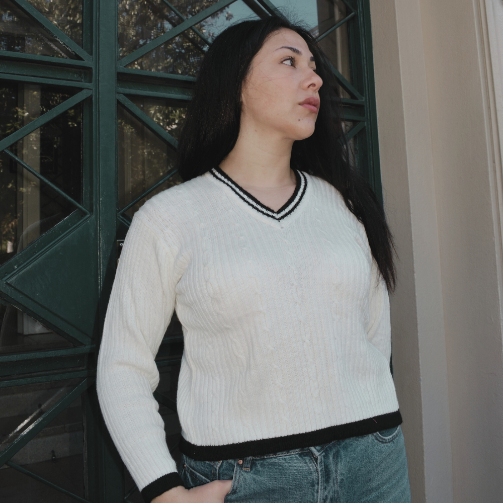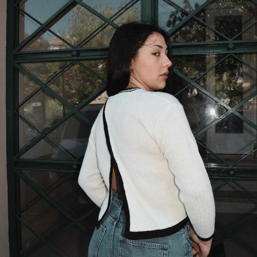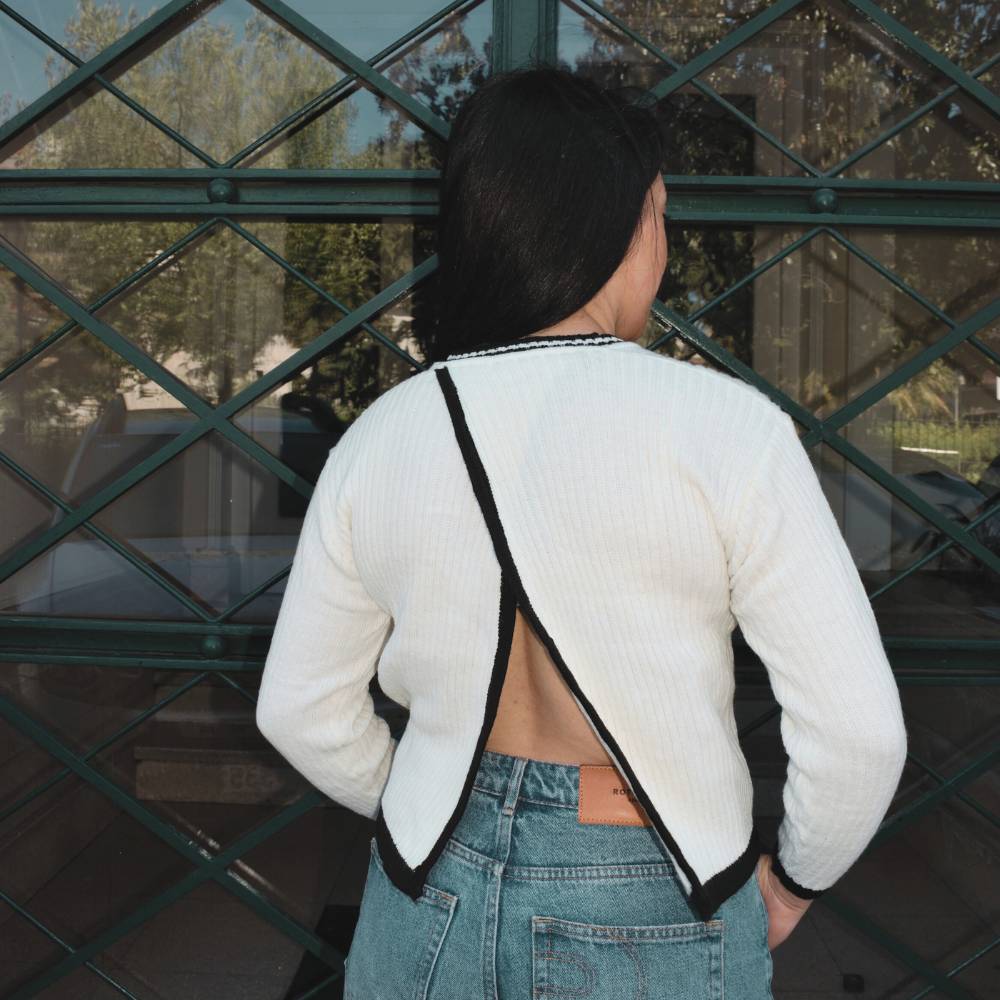 Suéter blanco de punto trenzado con cuello en V y vivos negros. El highlight: espalda abierta con cruce diagonal rematada en vivo negro, que deja ver piel o una capa interior. Largo a la cintura y calce cómodo con aire sporty–chic.