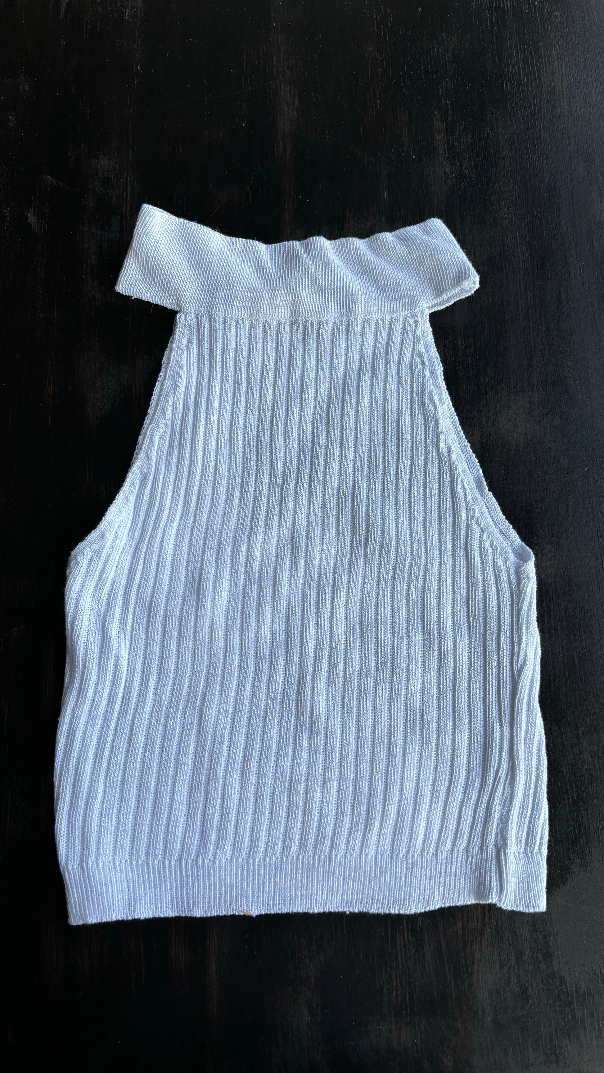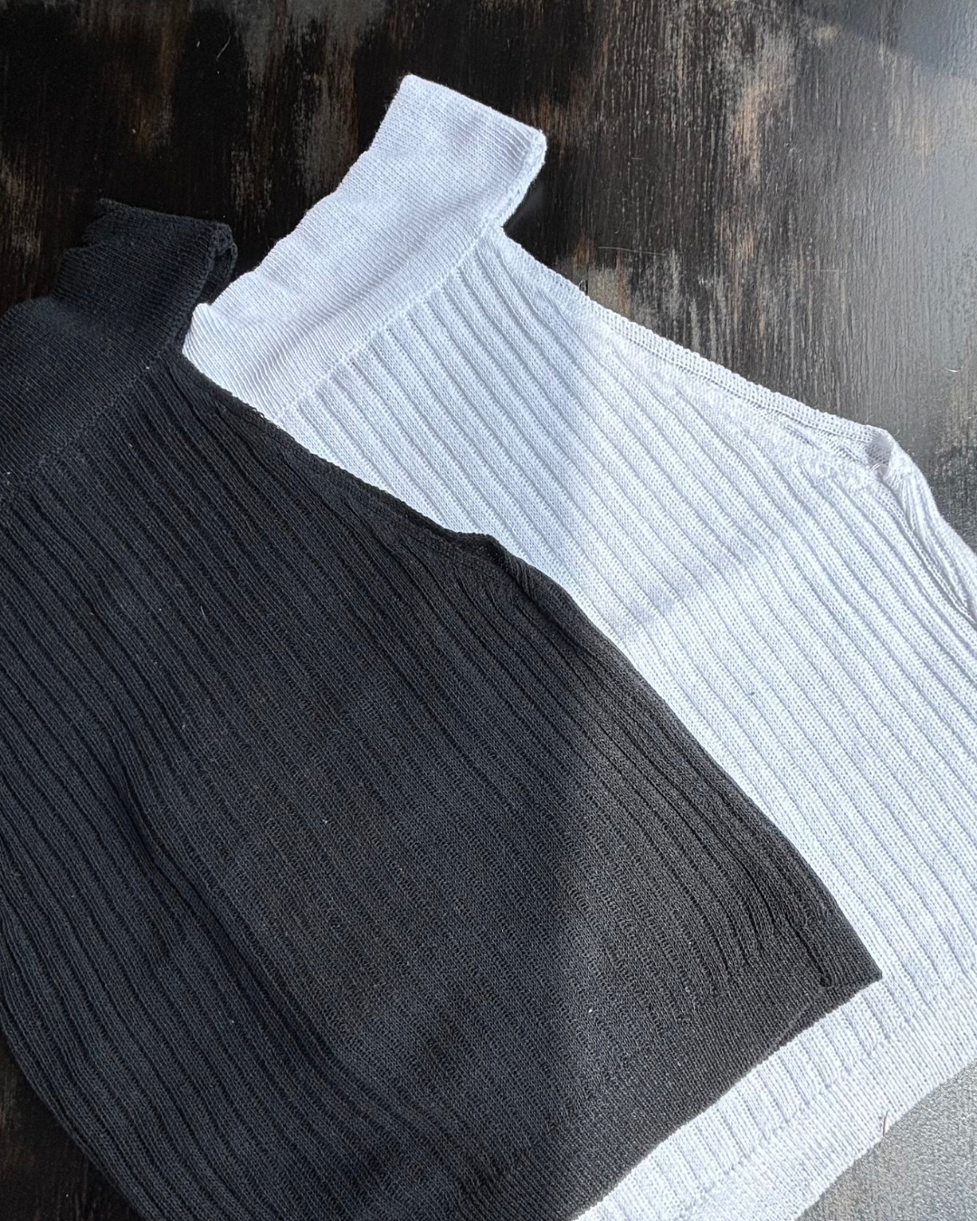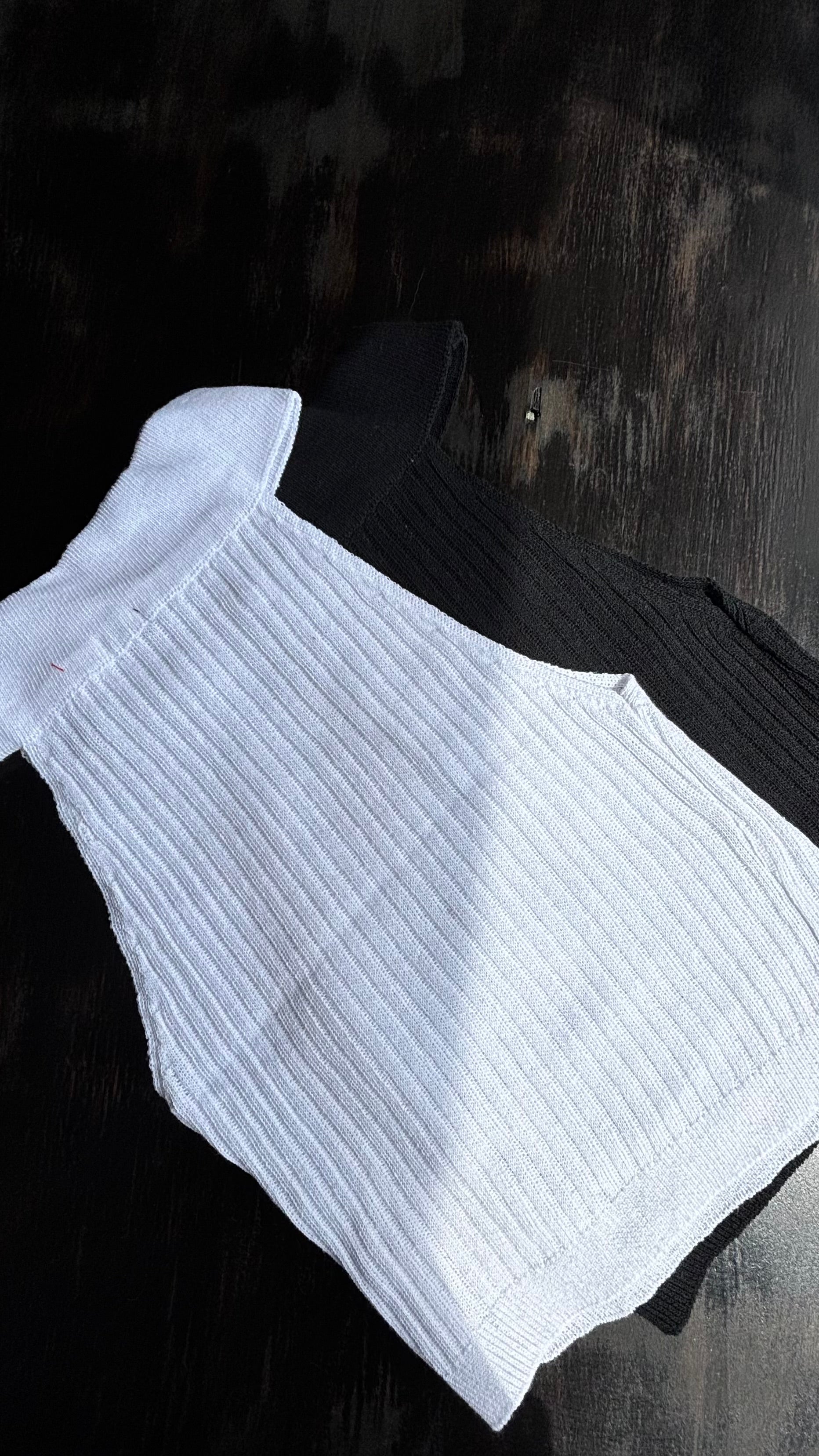 Está disponible en dos colores clásicos y versátiles: negro y blanco, ideales para crear múltiples combinaciones. El material es ligero, suave al tacto y con una textura acanalada que le da un aspecto distintivo y estilizado. Es una prenda ideal para utilizar en climas templados o como base de un look en capas durante épocas más frías.