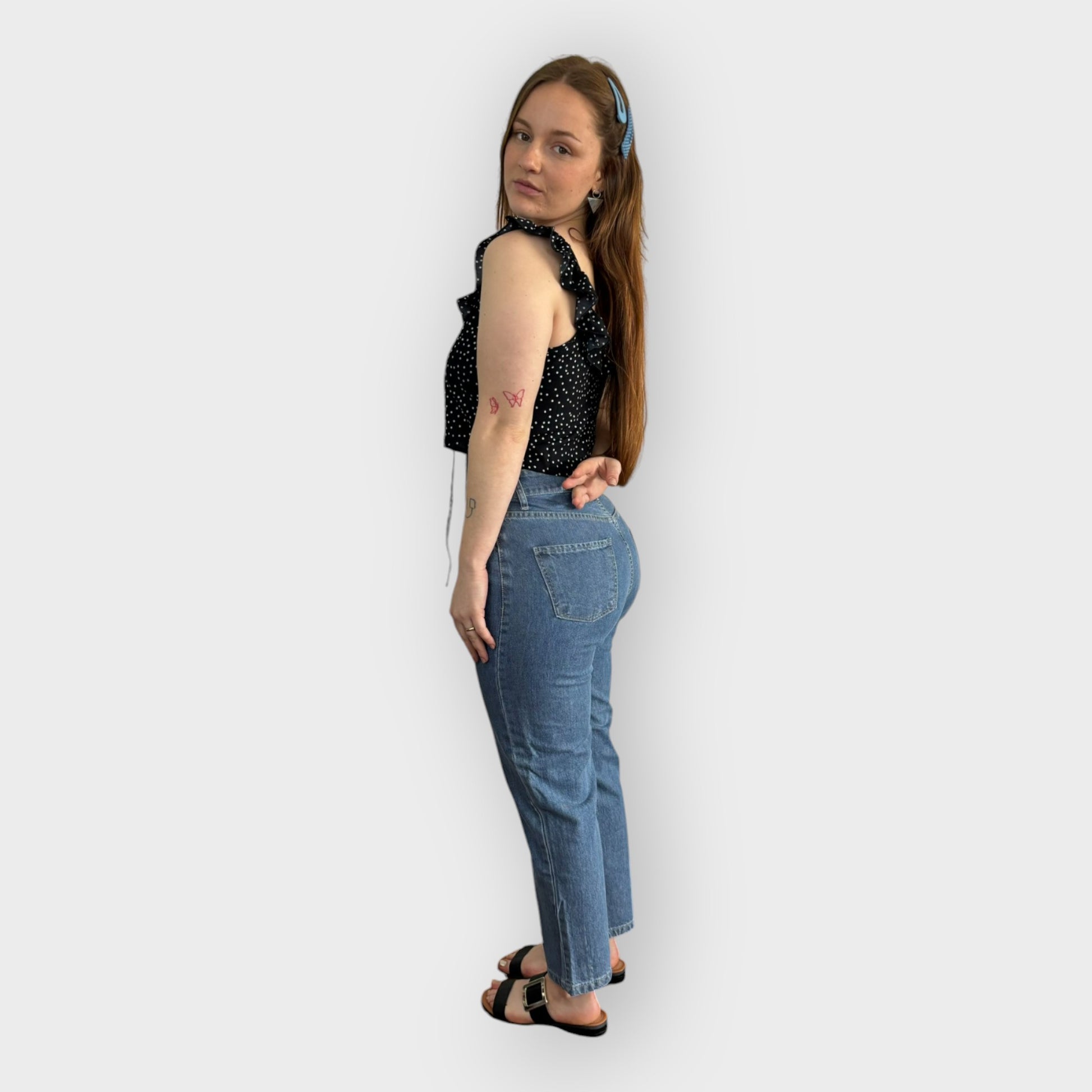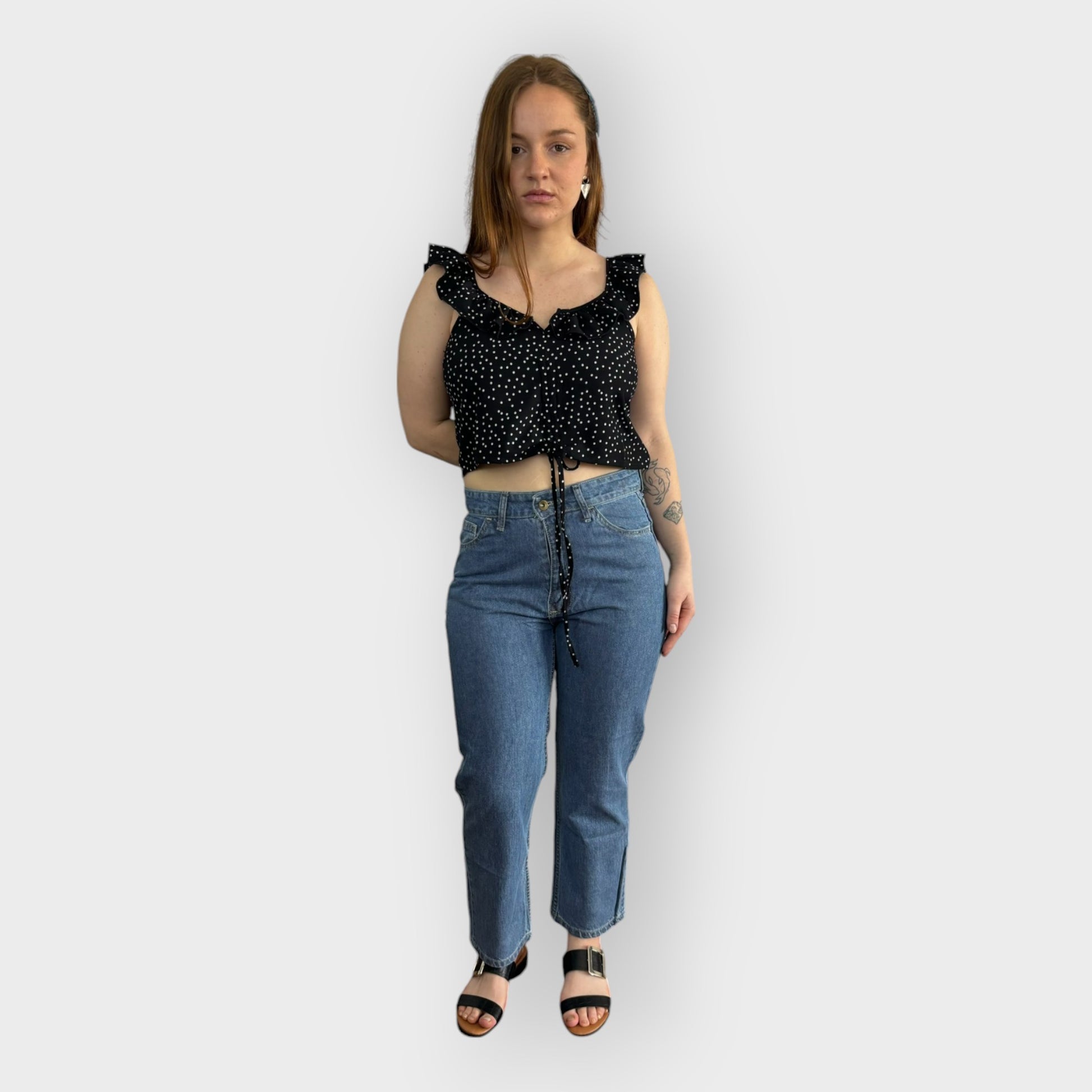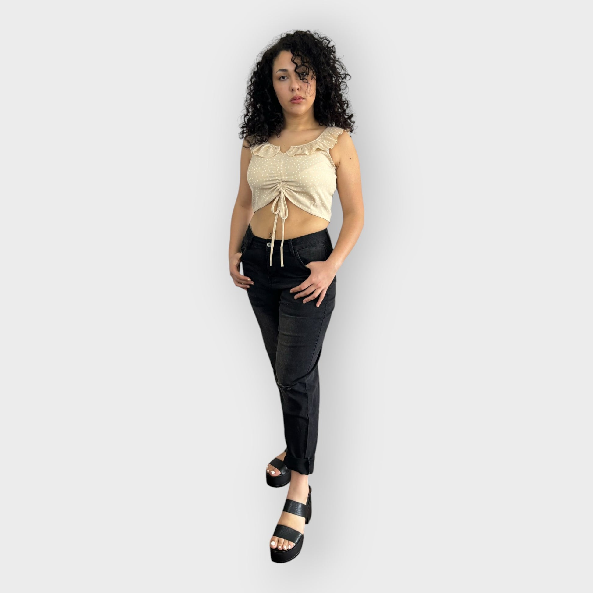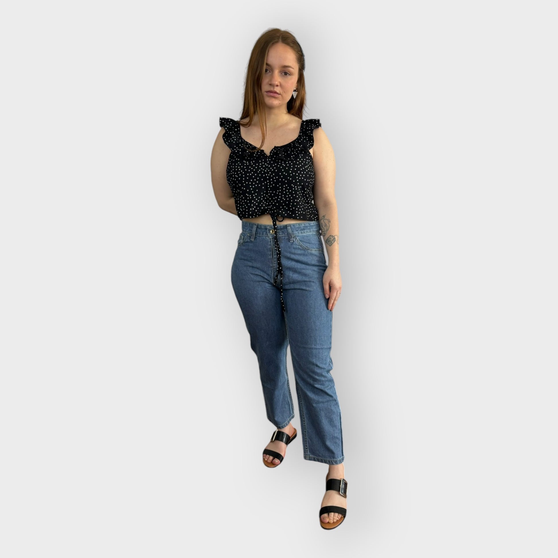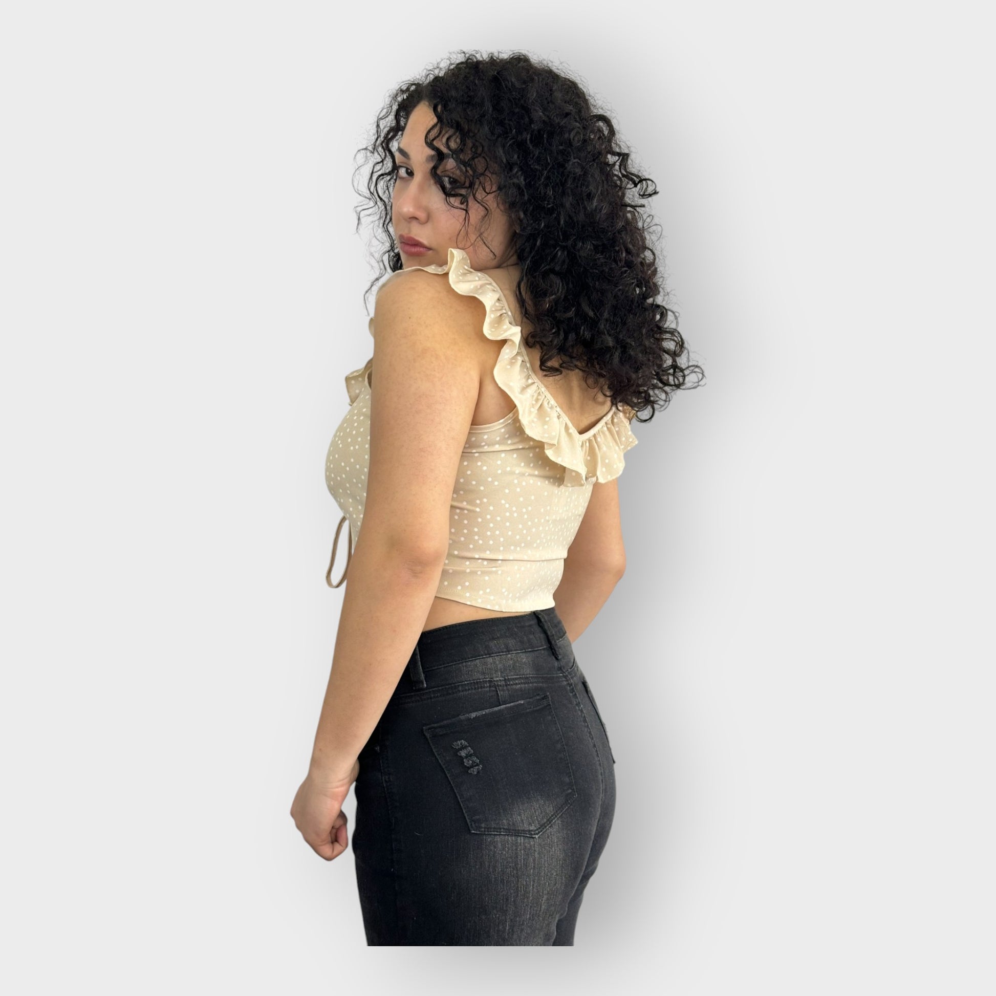 Este encantador top a lunares de ORA es la prenda perfecta para un look femenino y moderno. Disponible en colores negro, blanco y café con leche, cuenta con un delicado escote redondo adornado con un volado que le añade un toque romántico. En la parte delantera, una tira ajustable permite regular el largo del top, creando un fruncido elegante que termina en una moña o un nudo, según tu preferencia. Este top es ideal para combinar con jeans, faldas o pantalones, aportando estilo y frescura a cualquier conjunto.